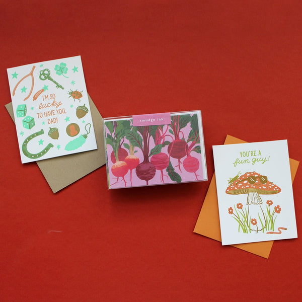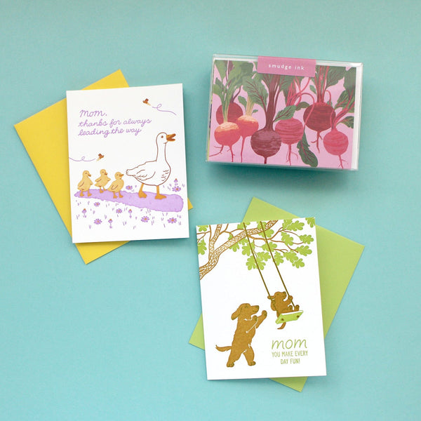 Suitable for thanks, celebrations, support, or just a friendly hello, our collection of blank letterpress and flat-printed boxed note cards are your go-to for any occasion. Keep a box or two handy for those spontaneous moments when you want to let someone know you’re thinking about them. Our flat-printed cards are Massachusetts-made, and the letterpress collection comes straight out of our own Acton printing studio. Each one is thoughtfully and lovingly illustrated by hand with the inside left blank so you have plenty of room for your heartfelt message.