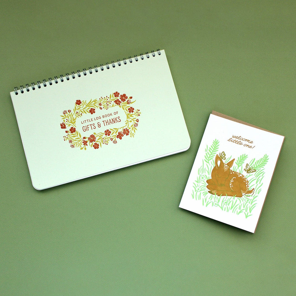 | included | 1) Napping Fawn Baby Card 2) Little Log Book of Gifts & Thanks |
