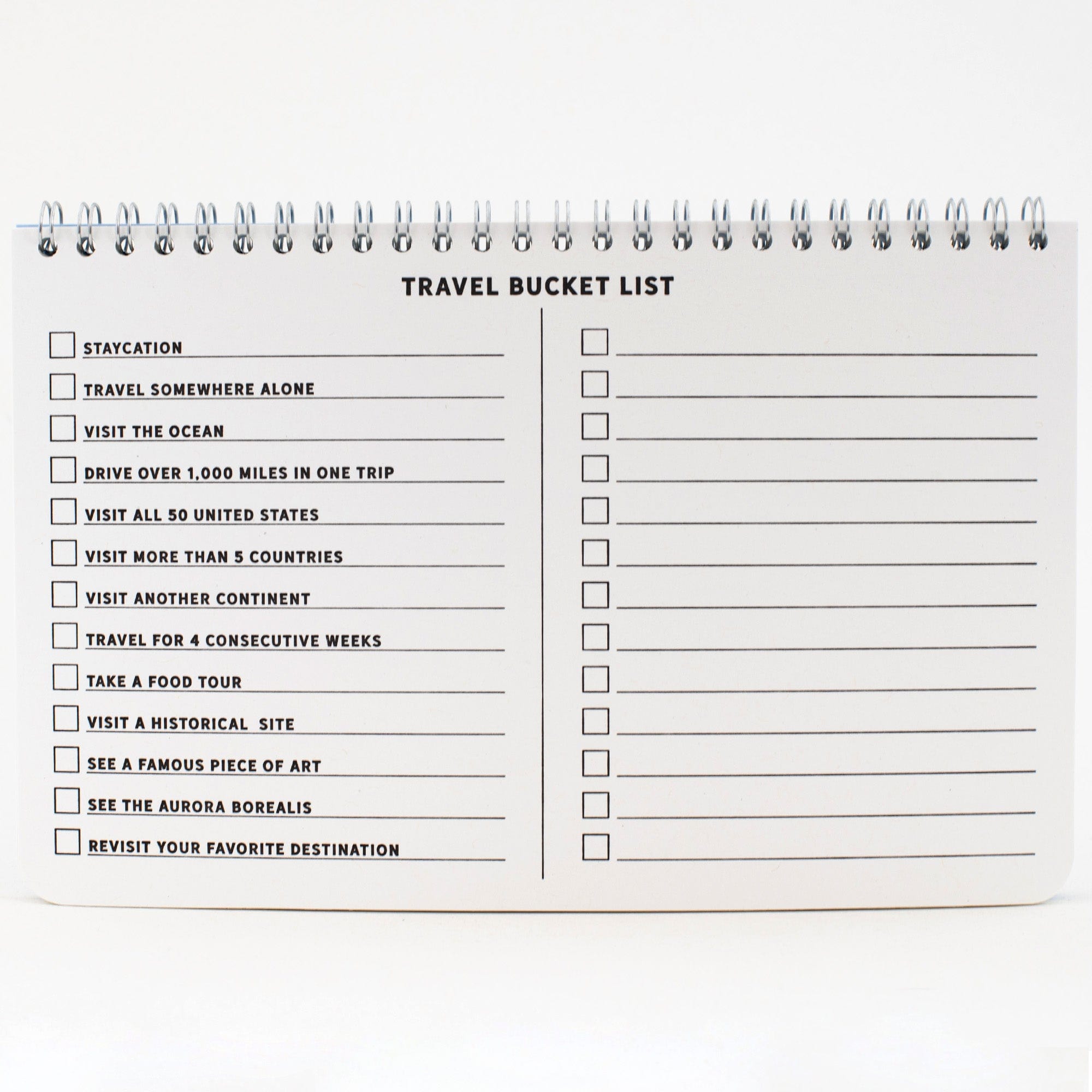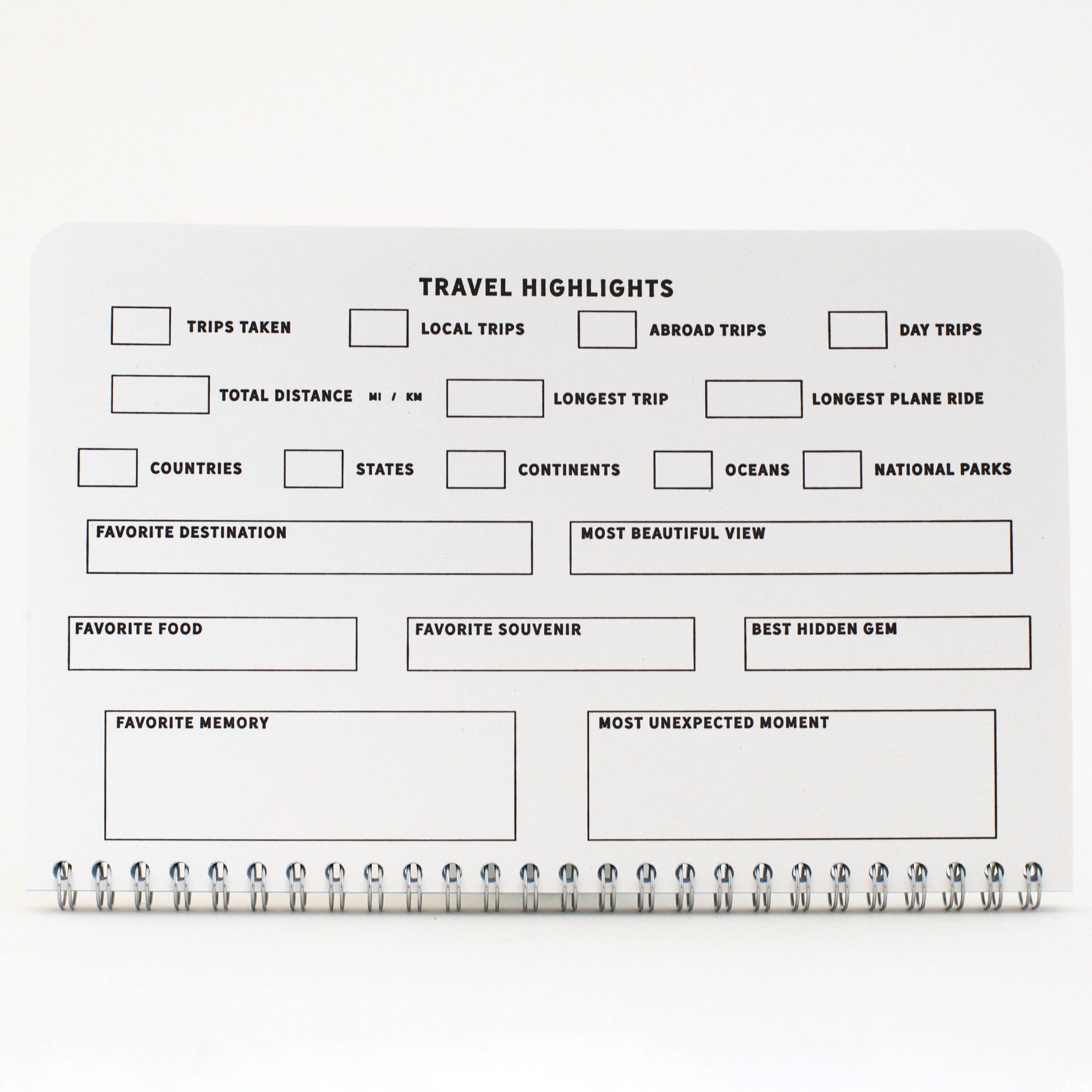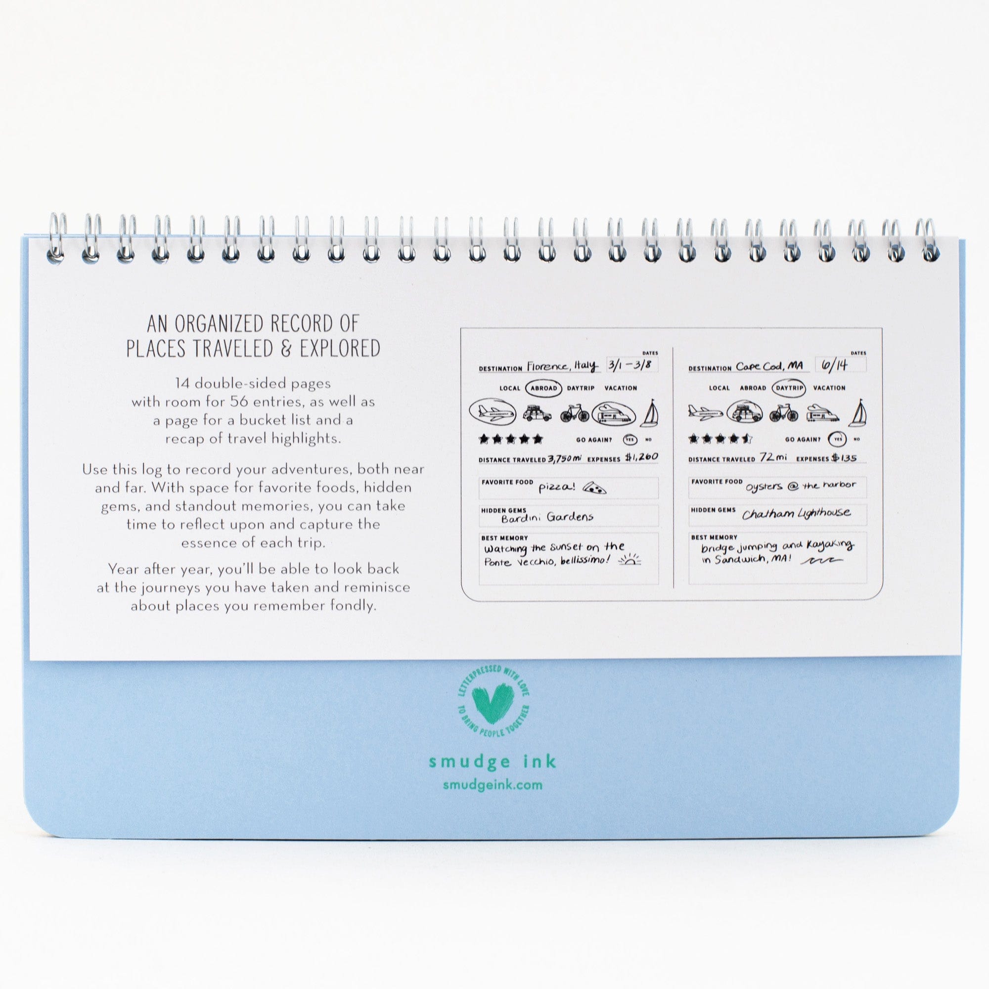 | inside | 15 double-sided log pages with space for 56 entries, a bucket list, and a recap of travel highlights |
