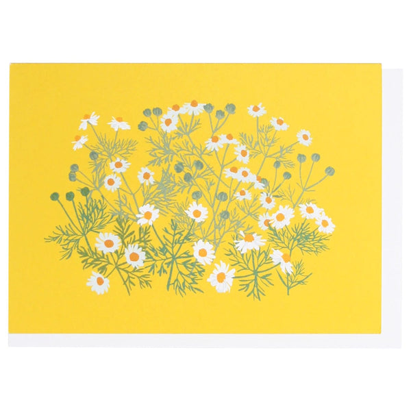 description Chamomile blossoms are like tiny daisies against a golden background.
