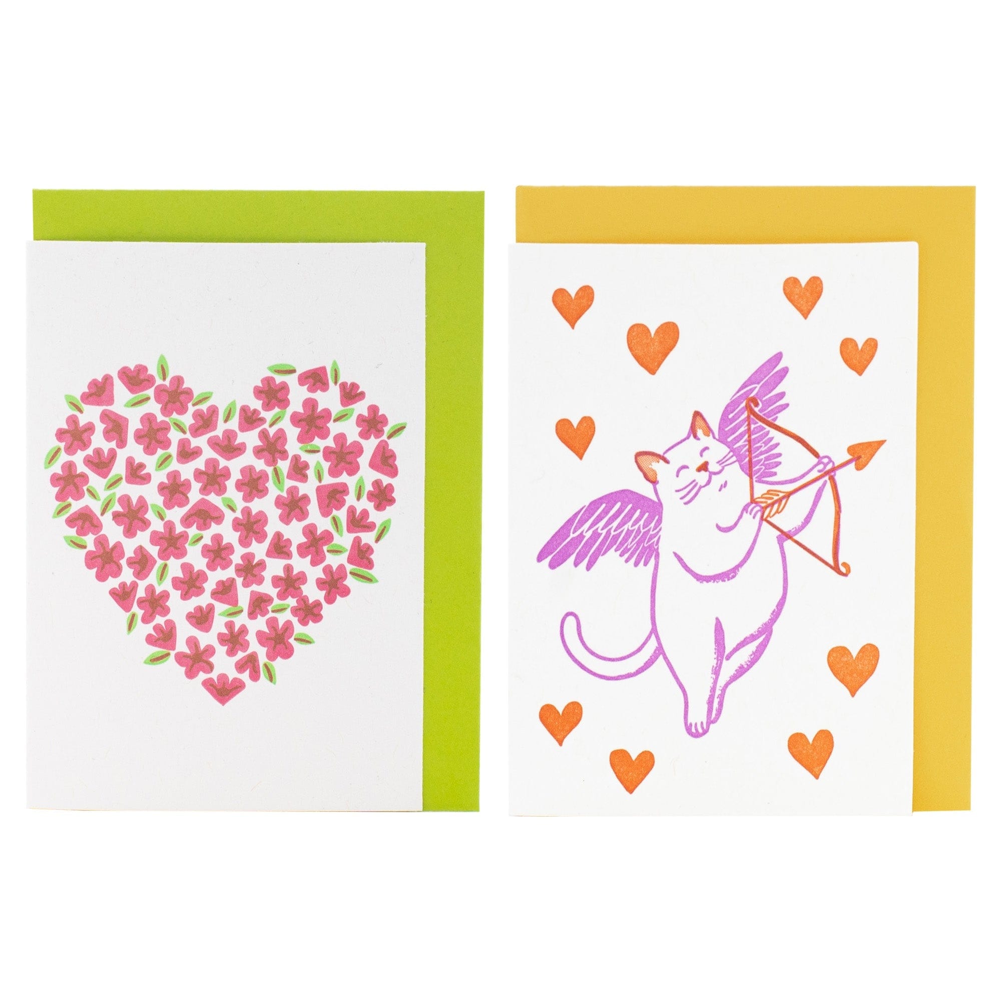 2 designs, 3 of each per box of 6 mini cards 1) Mini Blooming Heart Enclosure Card 2) Mini Cupid Cat Enclosure Card |